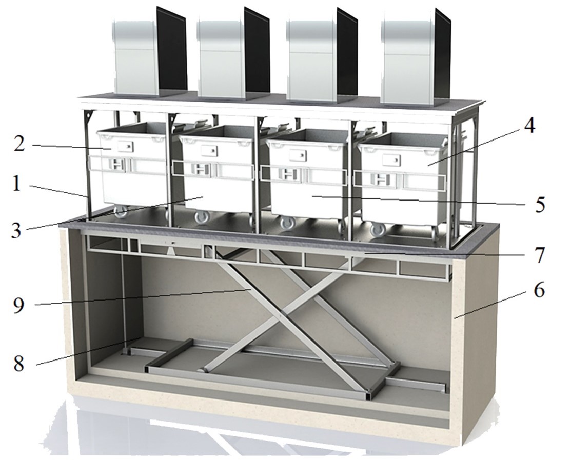 Платформа (1) з 4 контейнерами (2–5) опускається в підземний бетонний бункер (6) і зберігається там до повного заповнення. Коли контейнери заповнені, система подає сигнал для приїзду сміттєвоза, після чого платформа піднімається у верхнє положення для розвантаження. Після спорожнення контейнери встановлюються назад, і гідропривід знову опускає платформу вниз.